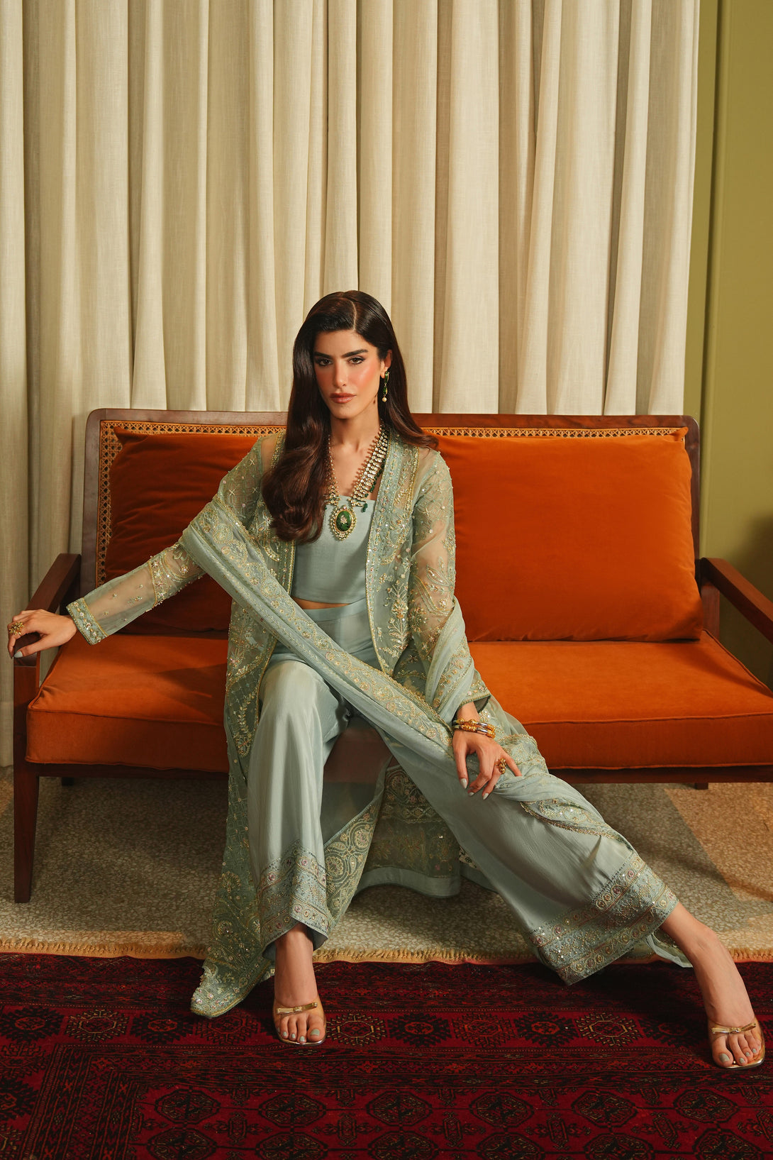 This striking four-piece set features a structured inner bustier paired with a flowing open-front gown adorned with intricate embroidery, luminous sequins, and meticulous adda work throughout. Dramatic sleeves showcase matching embellishments with delicate hangings at the hemline. The ensemble includes sophisticated culottes with embroidered hems for ease of movement. Completing the look is a diaphanous net dupatta with an eye-catching center spray design, embroidery and sequin detailing, and two ornate borders framing both sides.